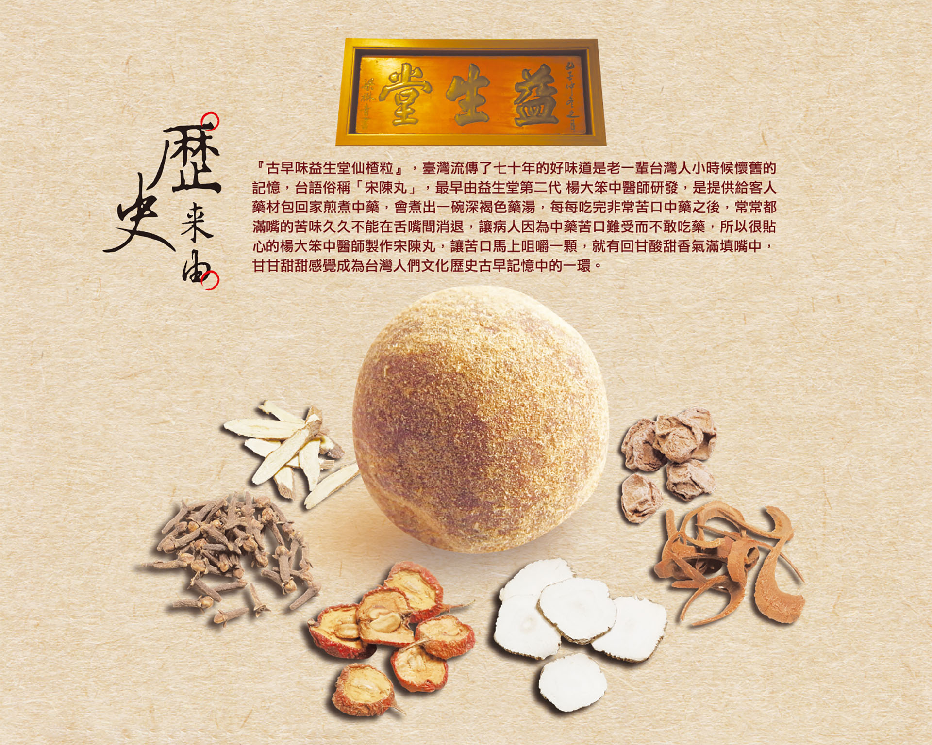 『古早味益生堂仙楂粒』,流傳了七十年的好味道是老一輩台灣人小時後懷舊的記憶,台語俗稱「宋陳丸」,最早由 益生堂第二代 楊大笨醫師研發,是提供給客人藥材包回家煎煮中藥,會煮出一碗深褐色藥湯 ~~~~(苦苦苦)