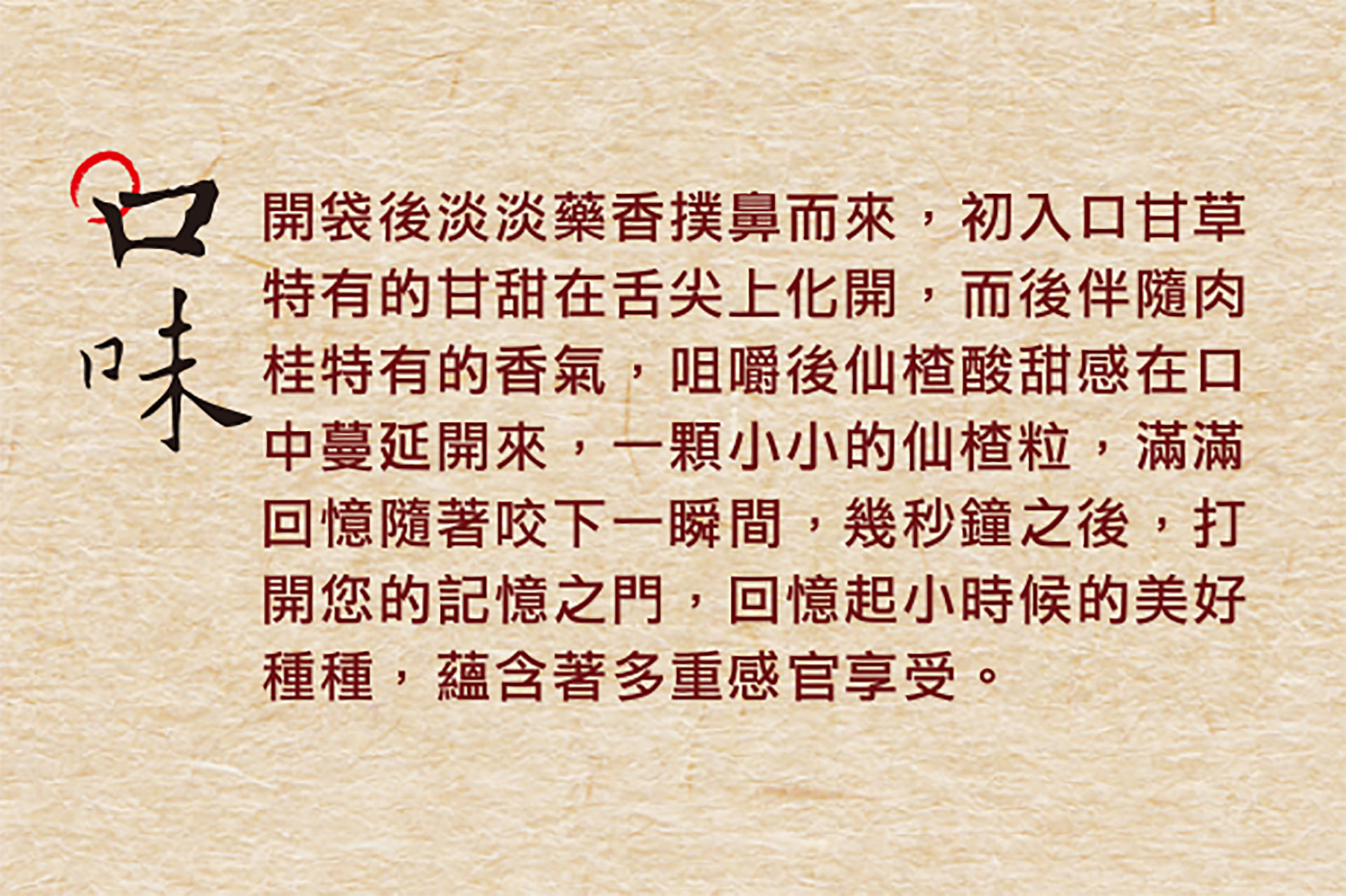 開袋時淡淡藥香撲鼻而來,入口後甘草特有的甘甜在舌尖上化開。伴隨肉桂特有的香氣,咀嚼後仙楂酸甜感在口中蔓延,一顆小小的仙楂粒,甘甜的感覺是台灣人們古早記憶中的味道。