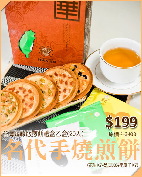 花生口味: 爽口的煎餅,伴隨著濃濃花生香氣及飽滿花生顆粒,是您居家品茗或饋贈送禮的最佳選擇。