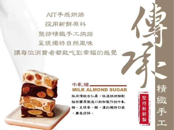 A.I.T.烘培坊牛軋糖,不甜不膩香軟馥郁的好滋味大獲人心,口感回味無窮,更榮獲媒體報導。