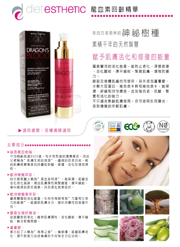 Diet Esthetic西班牙龍血素是取自龍血樹保養品,從中南美洲珍貴的龍血樹萃取,西班牙龍血素是歐美正夯龍血樹保養品,安潔莉娜裘莉與眾多歐美明星都愛用,精華液推薦西班牙原裝進口的龍血素回齡精華。