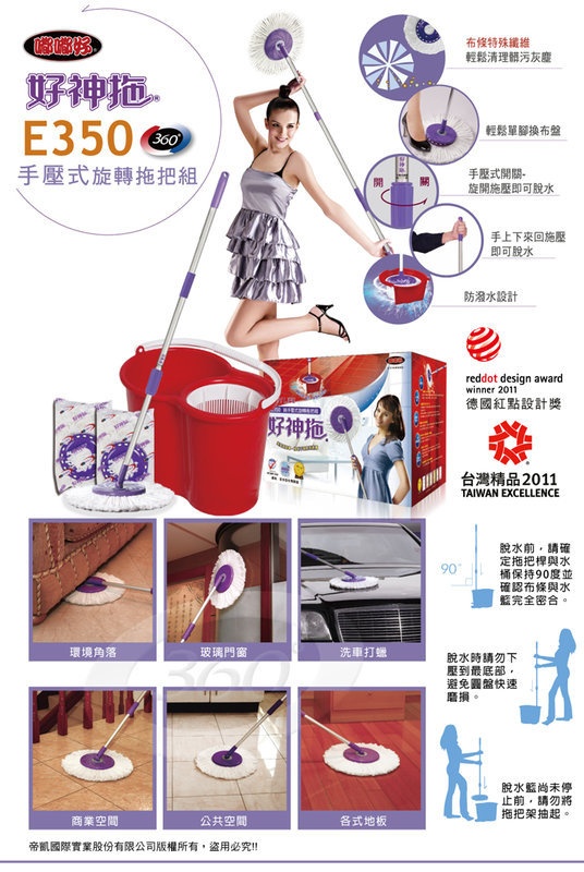 內容物:主拖把架x1件、脫水桶x1件、拖把布盤x3件