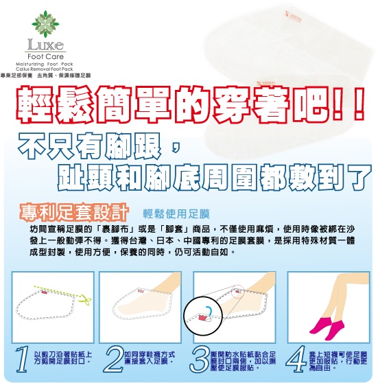1.去角質足膜:每次使用時間90-120分鐘,取下後以清水沖洗即可。