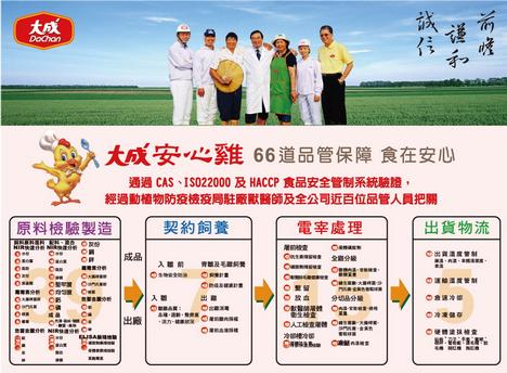 1957年的台灣物資仍極為缺乏,創辦人韓浩然先生與同為北方人的牟清善先生,秉持著「誠信.謙和.前瞻」的原則與信念,在台南開辦了一間小黃豆榨油廠,大成公司終於正式開始營運。歷經50多年不斷地演進與改革,大成集團現依區域,將營業項目分為:基本農畜事業群、東亞事業群、麵粉事業群、餐飲服務事業群、前瞻事業群等五大事業群,繼續為您健康的生命努力。
