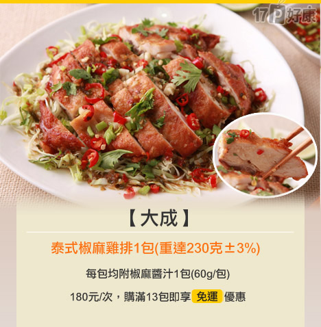 12/4(二) or 12/6(四)可取貨~快速17P好康團]只徵3天~大成泰式椒麻雞排17P專案合作超值價每包只要49元(購滿13包即免運費) | 大成集團
