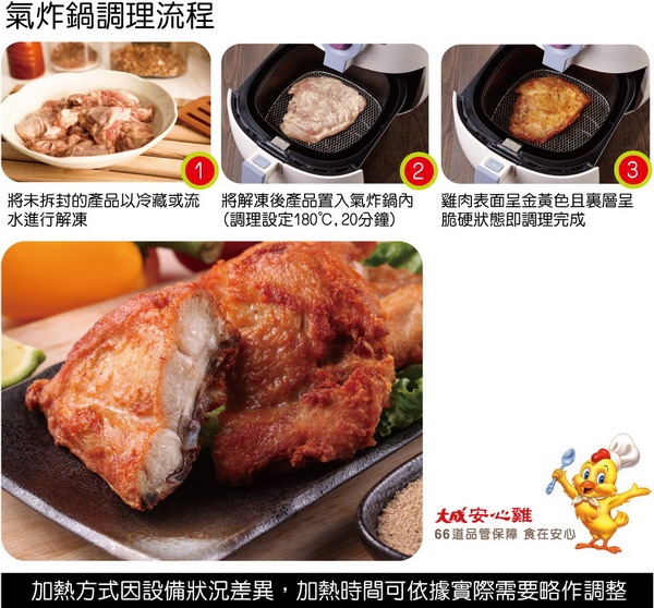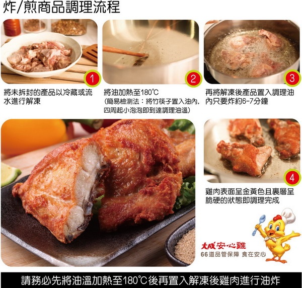 未預炸/煎商品,重達310克±3%/包(3支雞腿) | | 未預炸/煎商品,重達230克±3%/包(1片雞排)及60克椒麻醬汁/包(1包) | 未預炸/煎商品,重達230克±3%/包(1片雞排)及40克泰式醬汁/包(1包) |