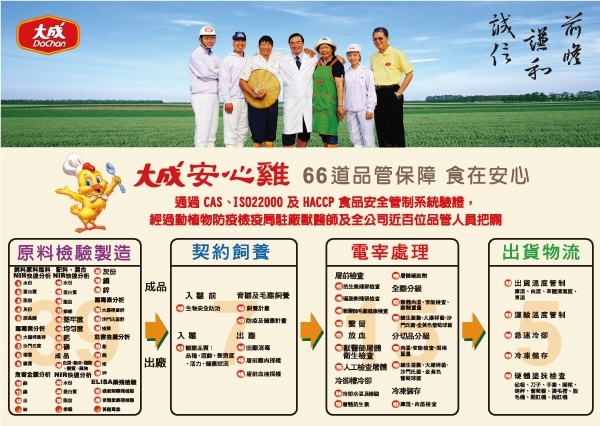 大成所提供的雞肉,具有溯源安心的保證。每一隻大成安心雞都是通過嚴格的66道品管流程,讓您可以享有品質保證的雞肉產品。