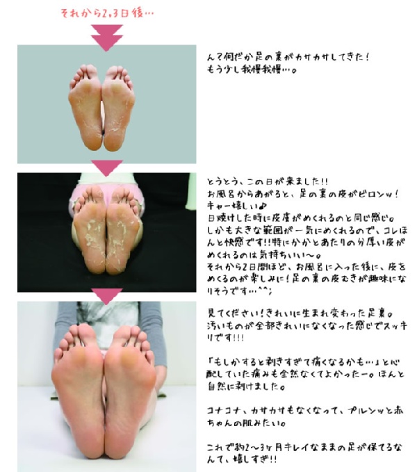 4、使用後約 5 ~ 7 天,腳上的老廢角質會逐漸脫落。大約 1 ~ 2 星期後,老廢角質脫淨,恢復如嬰兒般光滑柔嫩的美足,每個人的情況不同,有的人的腳掌及腳跟等角質很肥厚,回應就會較慢,請耐心等候