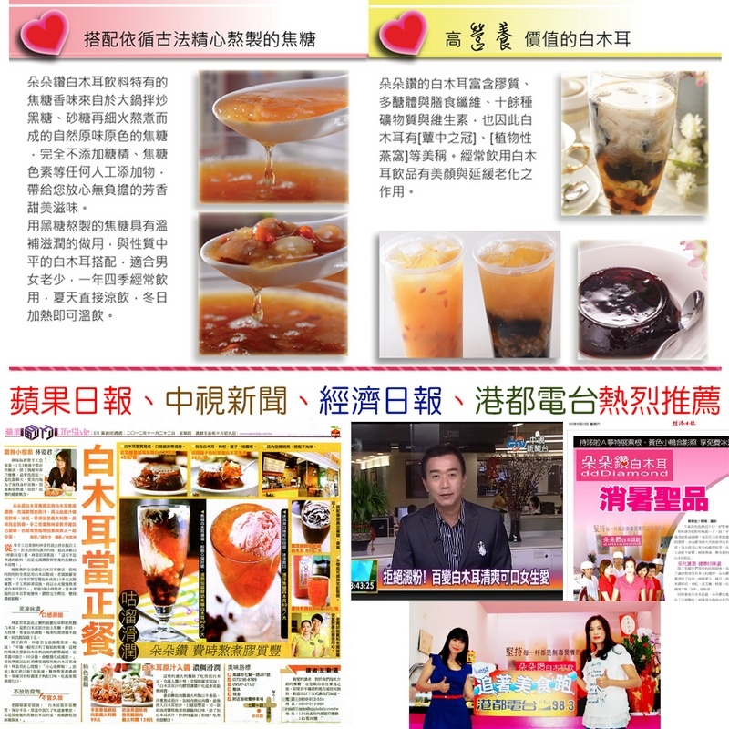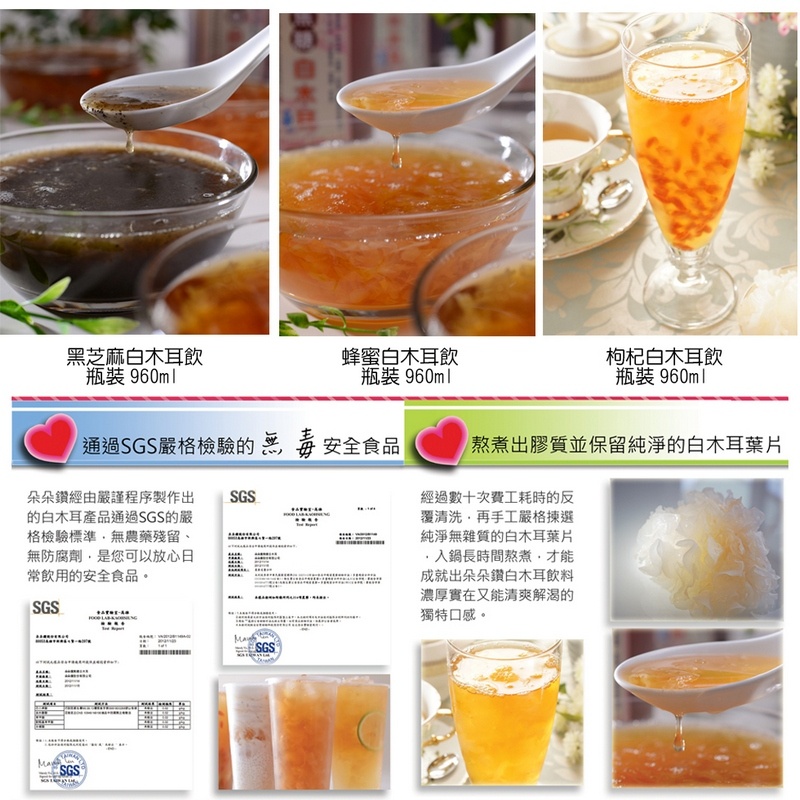 低溫烘培研磨而成的頂級黑芝麻醬,加上朵朵鑽的白木耳堪稱是養顏極品 | 明星級營養價值的枸杞,加上朵朵鑽用良心熬煮的白木耳,不可不嘗! | 同樣採用不加防腐劑有SGS驗證的客家仙草,仙草味道清新微醇,讓您喝的開心安心 | 採用有ISO9001認證的農場生產的桂花龍眼蜜,蜂蜜蜜香甜自然搭配朵朵鑽的白木耳,頂級的美味 |