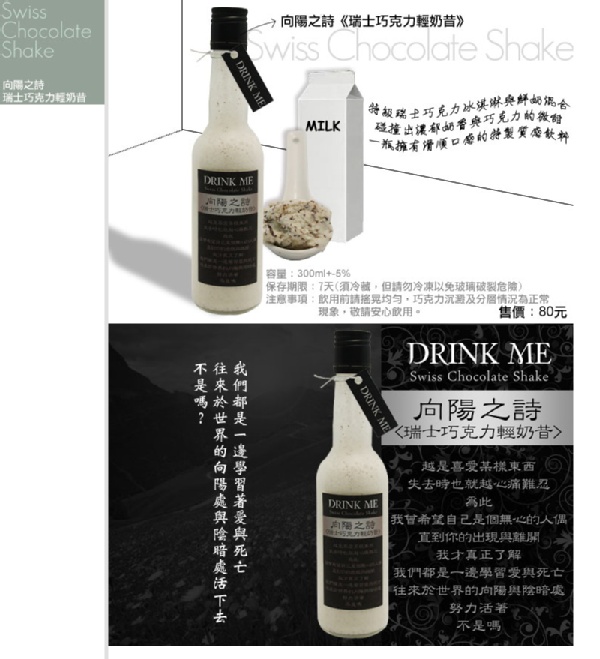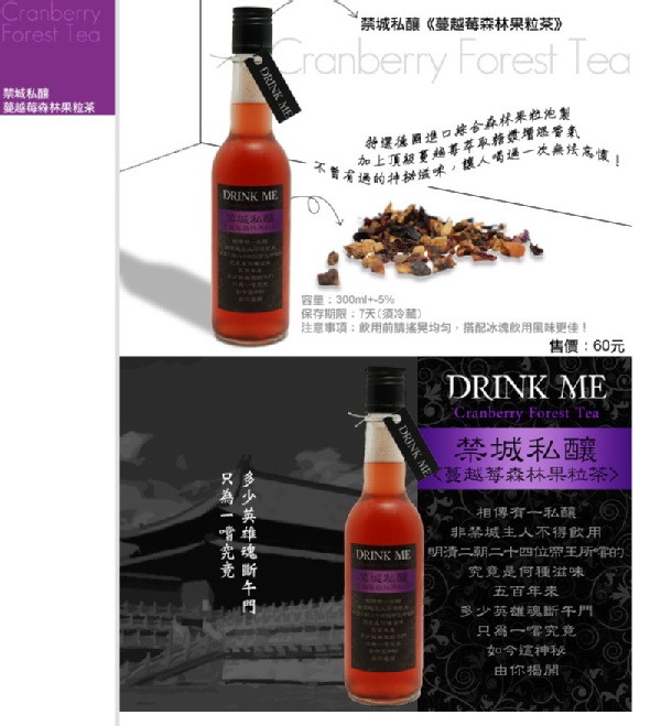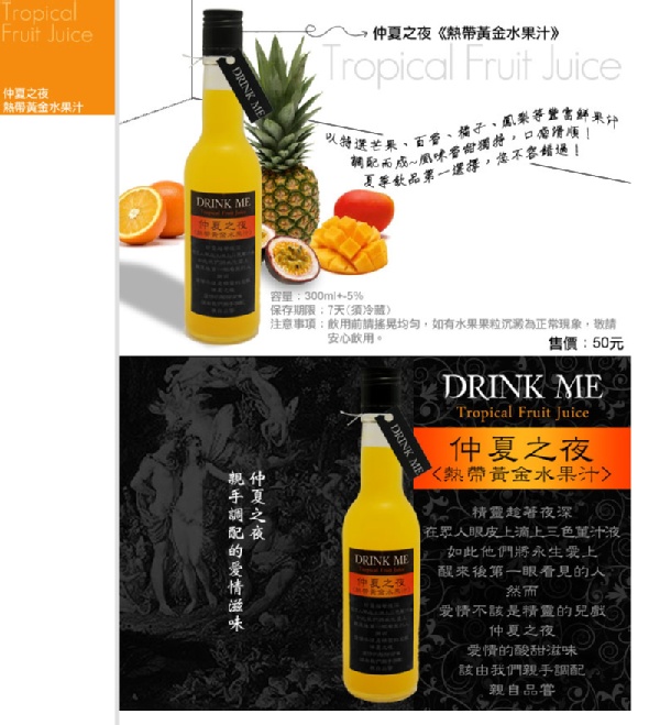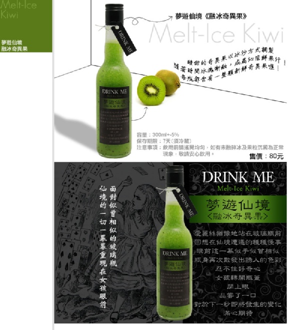 「DRINK ME創意飲料」以全新概念包裝調味飲料。我們以設計酒瓶盛裝各種新鮮調製的非酒精飲料,同時結合文字藝術,賦予每瓶飲料獨一無二的名稱以及故事傳說。