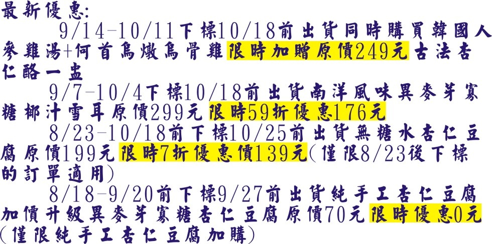 8/18-9/20前下標9/27前出貨原價70元限時優惠0元(僅限純手工杏仁豆腐加購)