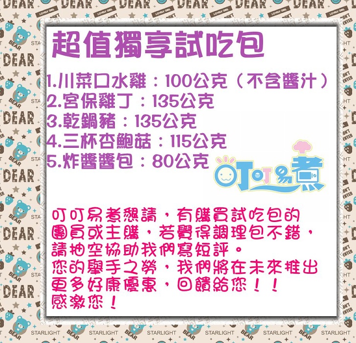 7.完款期限:由於試吃包需要特別製作,請主購下單後,確定一周內還款,以便叮叮易煮可以確定出貨量。