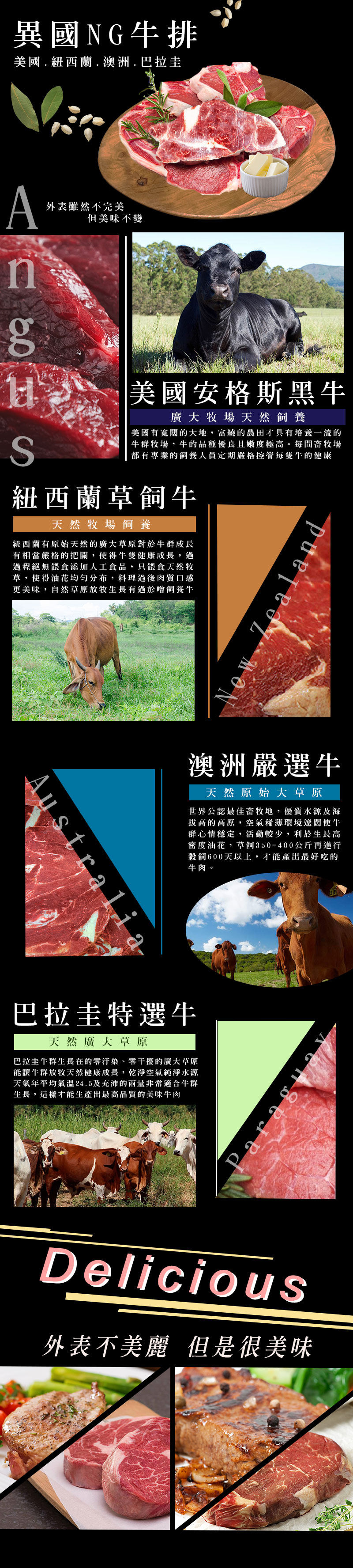 多國來源牛肉(美國、紐西蘭、澳洲、巴拉圭等)製作的NG等級牛排,每包500g,份量剛好、價格實惠!由於是整切邊料或不規則切型,可能帶筋、帶油、厚薄不一,但風味濃郁、口感實在。非常適合日常家常料理:可煎、可炒、可燉,也可切片炒牛肉飯、煮牛肉湯。冷凍包裝、隨取即用,是小家庭與小資族吃牛排、補蛋白的高CP好選擇!