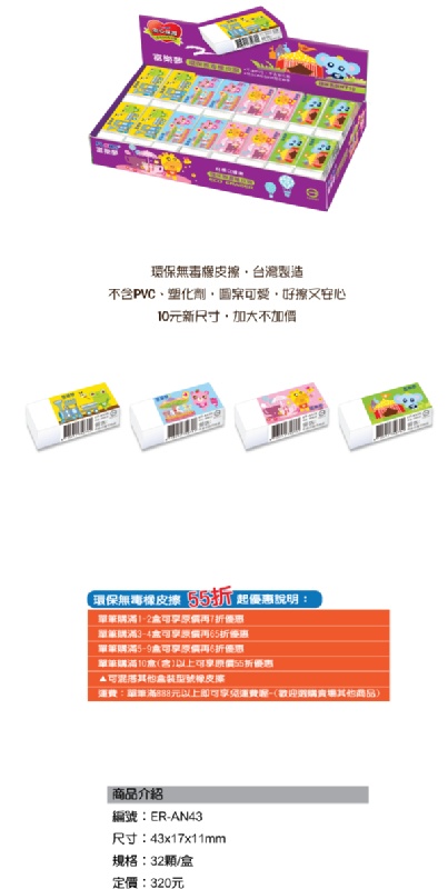 新品推出!環保無毒橡皮擦10元加大版新尺寸,超值新選擇~卡通款(32入)