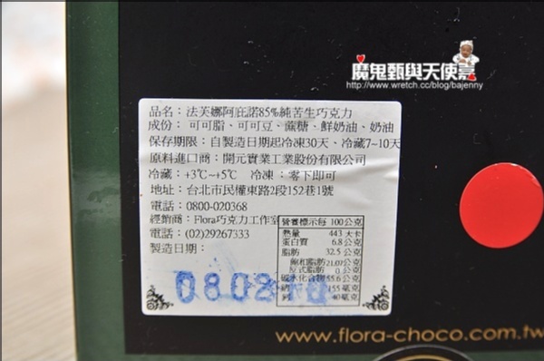 跟南投18度C的生巧克力相較,Flora生巧克力包裝較簡單(退冰時容易黏成一團),價位也較便宜,法芙娜阿庇諾生巧克力較苦,羅安哥娜莊園級巧克力帶酸,二者同樣都是成人口味,冷藏食用味道較強烈,冷凍後的口感也不會很硬。
