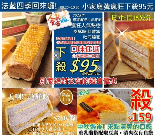 各位團友大家好, 歡迎團友一起來團購法藍四季~~超好吃的起酥火腿三明治小家庭號下殺只要95元!! 希望徵2,000元免運, 謝謝!