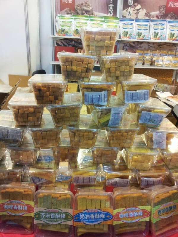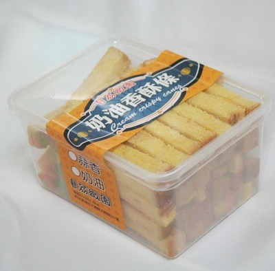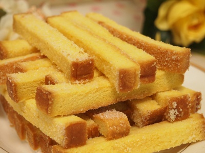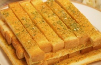 奶油香酥條的美味,只要嘗過就忘不了。這細細長長的小零嘴,脆口的「卡滋、卡滋」聲迷倒許多人。在看似簡單的食物上,其實背後的製作工序可一道都不能省。將土司切條後,均勻地灑上糖粉,抹上奶油或蒜香口味,送入烤箱烘烤後,呈現亮麗的金黃色澤,微甜的幸福滋味就此誕生。