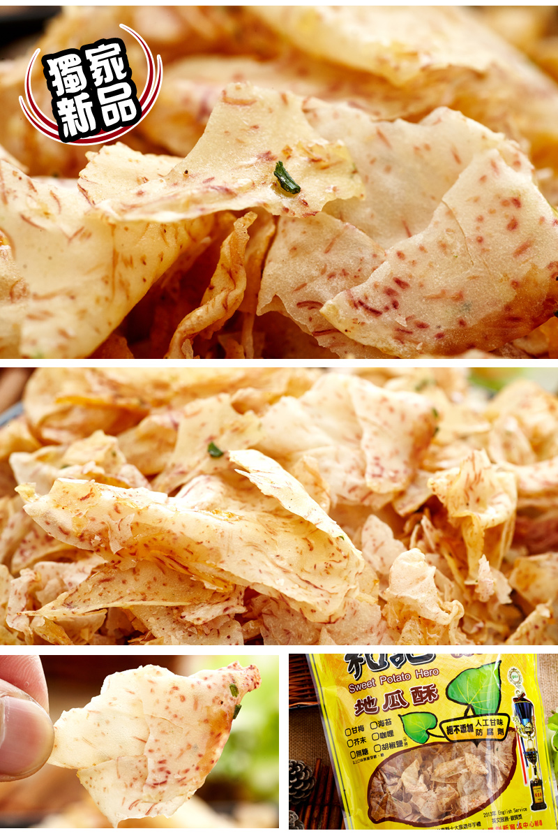 選用高品質芋頭,將芋頭切成薄片,將芋頭香氣完美保存於芋片中,吃得到最天然的芋頭原味,微微的甜味,讓人忍不住一口接一口,好吃得無法停下來!