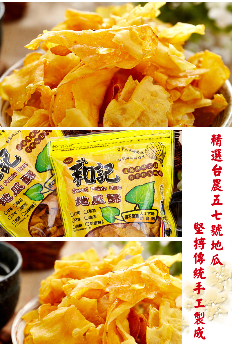 精選台農57號地瓜,堅持傳統手工製成,並且不添加人工甘味及防腐劑,讓人吃完不易口乾舌燥,且透過脫油等處理程序,除了能充分保留食材原味外,更替顧客的健康把關。