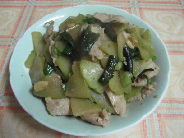 做法:佛手瓜去皮切片先燙熟,松阪豬肉切薄片先煎熟
