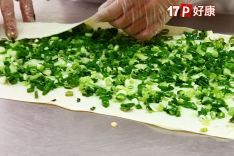 麵皮完成後,鋪放青蔥的步驟也完全不馬虎,在師傅全程專注下,