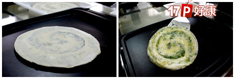 開小火煎3~5分鐘左右,等蔥油餅身慢慢呈透明、表面開始焦黃時,小心翻至另一面。