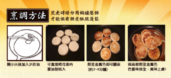 【調理方式】: 不須解凍,平底鍋內油熱後放入蔥油餅,煎至兩面金黃即可食用