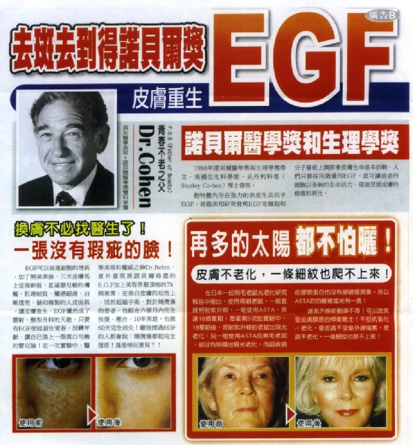 1986年諾貝爾醫學獎和生理學獎得主,美國生化科學家史丹利科恩(Stanley Cohen)博士和義大利女科學家Mantalcini教授發現動物體內存在強力的表皮生長因子(EGF - Epidermal Growth Factor),經臨床和研究發現EGF在細胞和分子層級上調節著皮膚生命基本活動,人們只是採用微量的EGF就可讓衰老的細胞以全新的生命活力促進受損皮膚的修復和再生.EGF又被稱為"美麗因子",人體的EGF含量決定著皮膚年輕的程度.本公司生產的EGF精華液膠囊,早晚洗臉後使用一顆精華液塗敷於臉部及頸部,具有以下的功能: