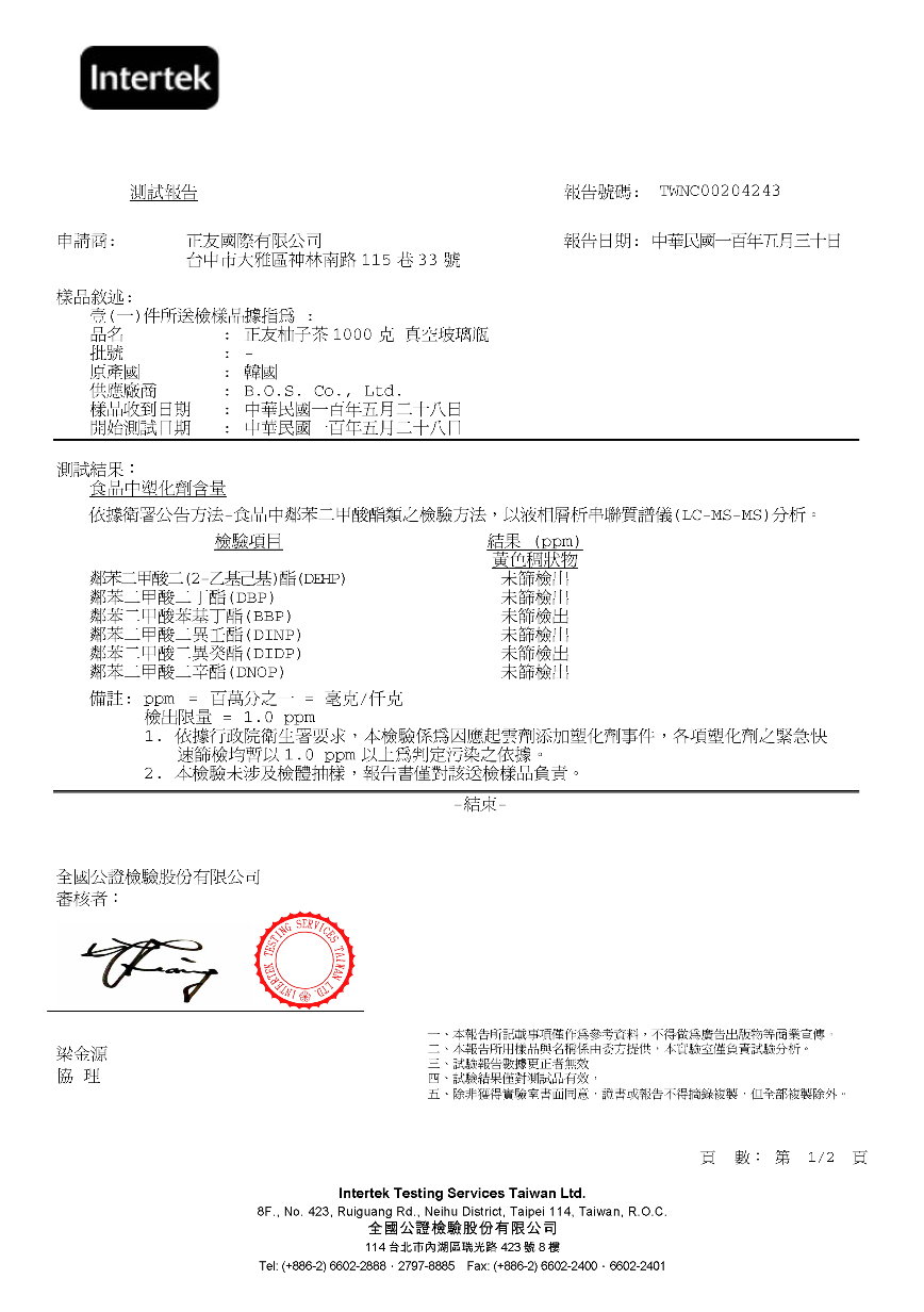 正友柚子茶通過intertek 檢驗, 不含防腐劑