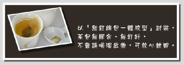 3.以「無釘線包一體成型」封裝,茶包無膠合、無釘針,