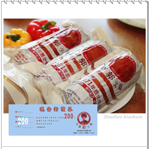 折價券說明: 購750g黑豚火腿2條或900g火腿2條送200元折價券1張,購600g火腿2條送120元折價券1張。每1條火腿僅能使用1張折價券折抵(香腸不適用折價券,120元券僅能用於折抵600g火腿),且不得與其他優惠並用,可於花蓮總店現場使用,或來電、網站、電郵訂購時在店家出貨之前郵寄折價券予店家以抵用貨款。折價券使用期間為2021/11/15~2022/02/28,另使用折價券之金額並不計入2000元免運費條件中。