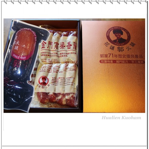 花蓮郭火腿源於1939年郭境盛阿公創立的郭榮市餅店,當時並代銷台北某日本商社手工煙燻火腿,阿公顧及早期北花交通不便,火腿常保存不易,便向商社日籍師傅學藝,返回花蓮後再進行調整配方,以滿足花蓮鄉親的口味,1976年並將其獨門技術唯一傳授予么兒郭榮標。這是記憶中的好味道,至今仍烙印在老主顧們心中,特色係以相思木炭烘烤、檜木屑煙燻等古早工法製作,才能有令人讚不絕口的好滋味,為手工火腿中的極品,送禮自用皆相宜!