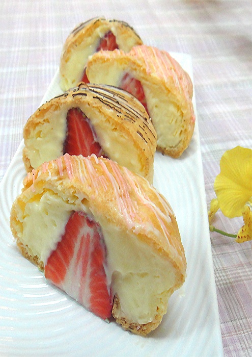泡芙巧莓孃 柔柔的奶蛋泡芙 上撲白巧克力與草莓巧克力線條