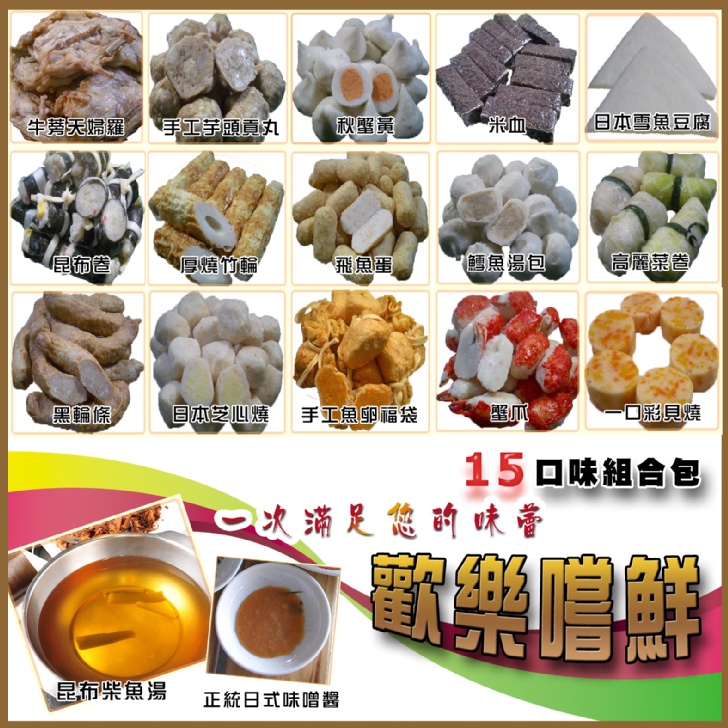 規格:牛蒡天婦羅.手工芋頭貢丸.秋蟹黃.米血.日本鱈魚豆腐.昆布卷.日本厚燒竹輪.飛魚蛋.鱈魚湯包.高麗菜卷.黑輪條.日本芝心包.手工魚卵福袋.蟹爪.一口彩貝燒..共十五顆(片、條).柴魚昆布湯*1包.日式味噌醬*2包