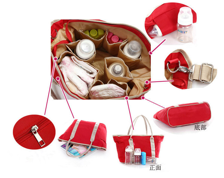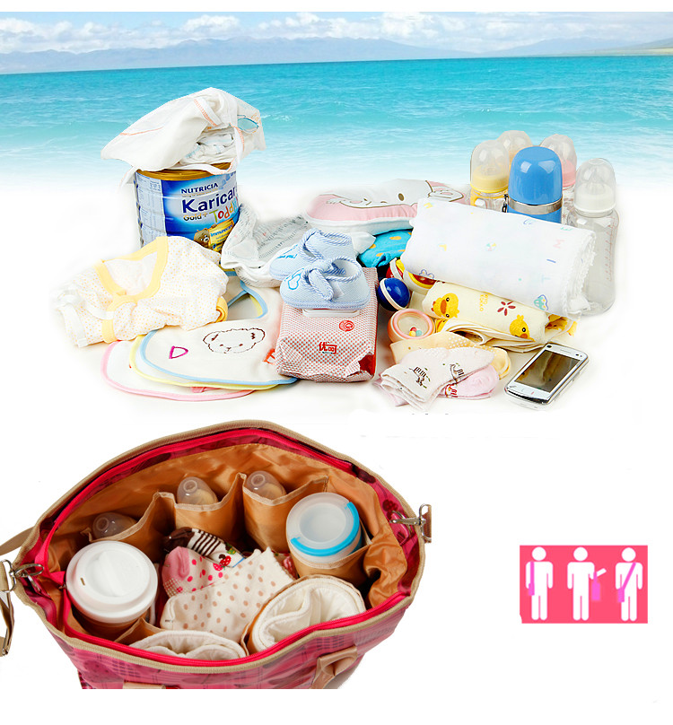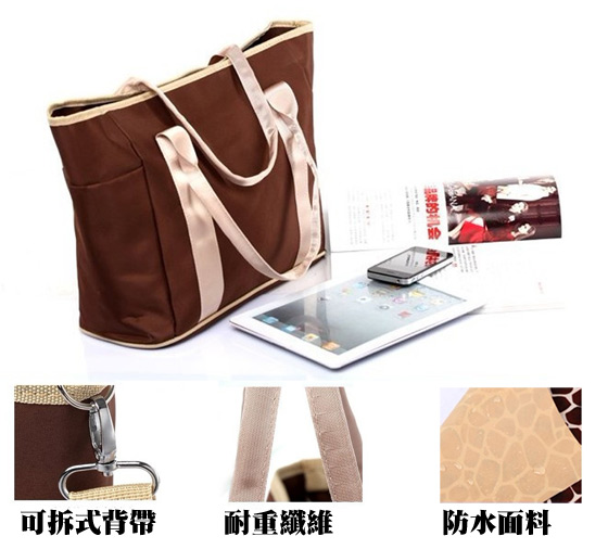 時尚多功能防水媽媽包,採用繽紛的防水布料製做,外表防水、耐髒,讓你在戶外能安心隨處擺放,內部格層比一般包包還多,方便你放進寶貝的尿布、奶粉、奶瓶、濕紙巾、爽身粉等物品,展開包包一秒就找到,孩子哭鬧的時候,它就是你的最佳小幫手!