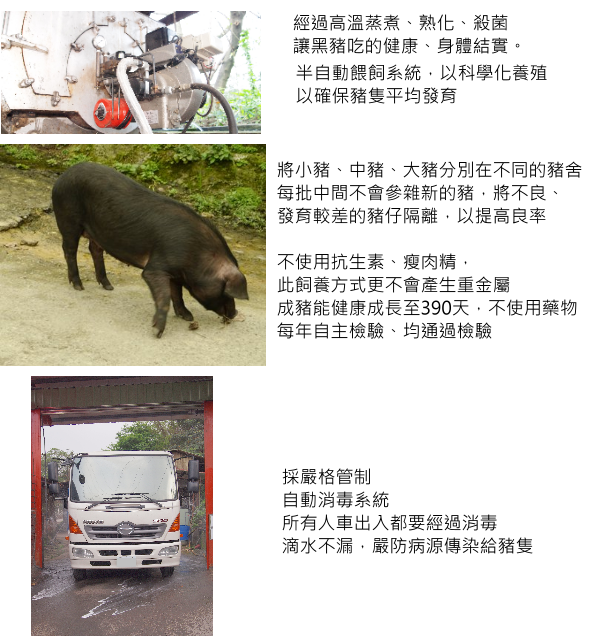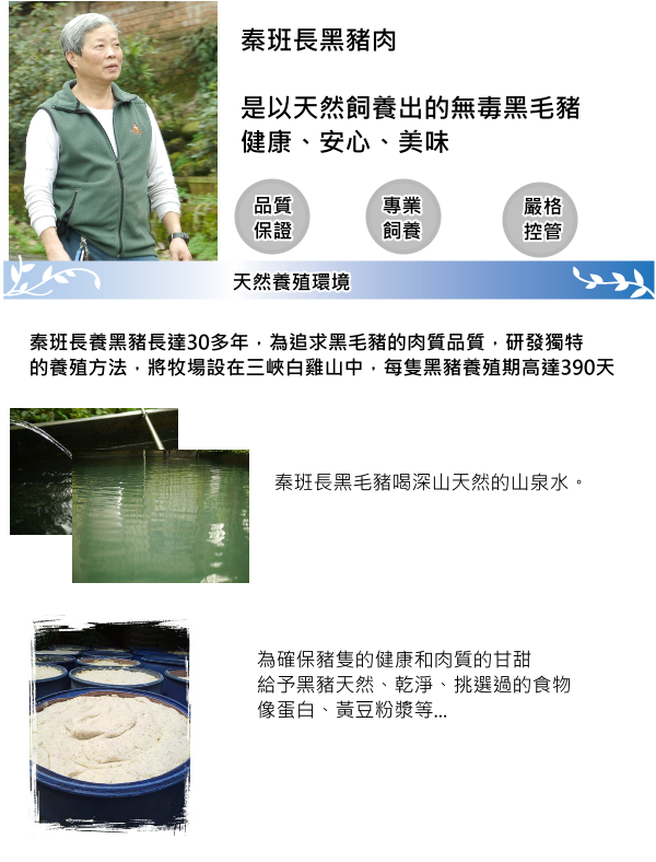 秦班長黑毛豬採天然養殖,養在深山中,不吃飼料、只吃挑選過後的食物經500度高溫蒸煮,飼養390天