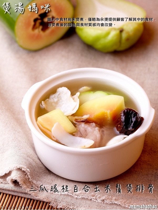 木瓜、佛手瓜、葫蘆瓜、瑤柱、玉米鬚、百合、蜜棗、排骨
