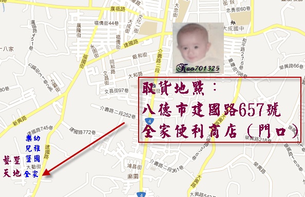 (主購家附近)取貨地點地圖:八德市建國路657號(全家便利商店門口)