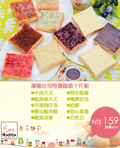 宅配:只要159元即可帶走【馬芬麵包】 原價295元湯種吐司特選超值十片組:牛肉大王x1+魷魚絲大王x1+芹菜吻仔魚x1+櫻花蝦肉鬆x1+鮪魚洋蔥x1+野生藍莓x1+爆漿奶油x1+奶酥x1+甜心草莓x1+巧克力x1