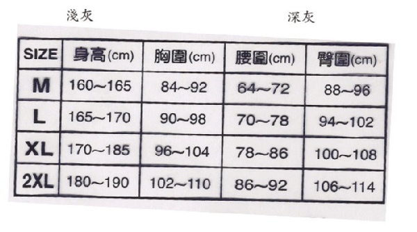 有淺灰和深灰兩色,也可以加買褲子(一樣99元),都有分SIZE~表如下: