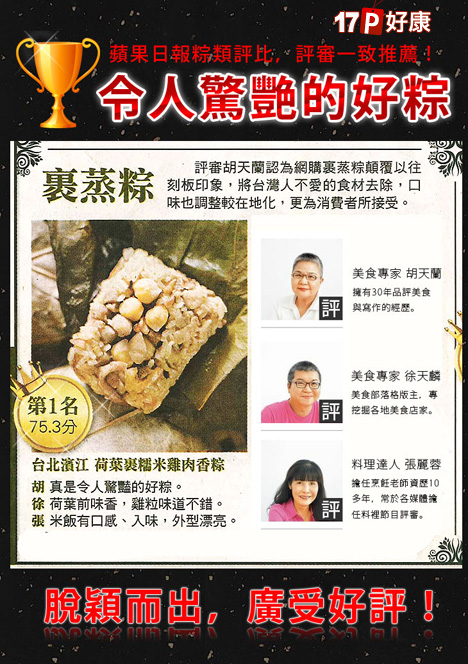 裹蒸粽評比冠軍,三大美食家讚譽有佳!(點圖觀看評選影片)