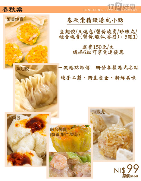 ♚ 關於春秋棠 買新鮮與一流港點師傅團隊合作,共同研發春秋棠港式名點,強調純手工,衛生安全的正港港點。