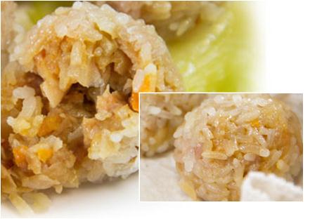製作珍珠丸子的主要材料有豬絞肉、蔬菜、糯米,製作時將絞肉和蔬菜拌成餡,作成丸子狀,再裹以糯米清蒸,成為晶瑩剔透、粒粒分明的美味,圓形飽滿外型,也有團圓喜慶之意。