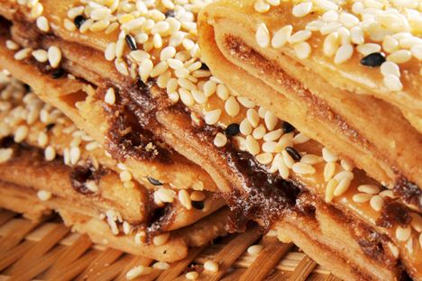 燒餅的製作,是要將麵皮分成好幾層不斷折疊、覆蓋,表皮塗上蛋汁、灑滿芝麻,內裡則夾帶各式口味內餡,一層一層口味豐富,咬下的每一口都酥脆,打造多層次口感。