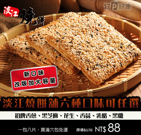 ●商品規格:【淡江燒餅舖】招牌燒餅:香蔥/黑芝麻/花生/香蒜/乳酪/黑糖(8片/包)