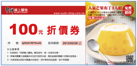 每筆訂單再隨貨附贈『爭鮮線上購物 Sushi Shop』100元購物金,購物金使用後,還可再贈芒果布丁3入組唷!