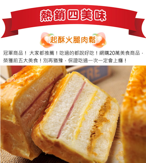 商品內容:全麥起酥火腿肉鬆(素)/夏威夷起士(葷)/燻雞起酥火腿/起酥火腿肉鬆