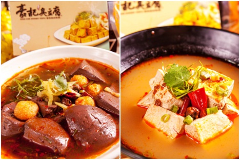 ►麻辣清蒸臭豆腐 將未炸過的臭豆腐加入爽口湯底中清蒸,保留豆腐原味,口感滑嫩多汁。佐上麻辣醬汁,湯頭香辣順口帶有自然鮮甜!