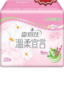 「靠得住」溫柔宣言草本抑菌23cm日用超薄衛生棉,萃取鈴蘭、薰衣草、雪松等十數種天然草本及海洋抑菌精華,有效抑制細菌,趕走異味。