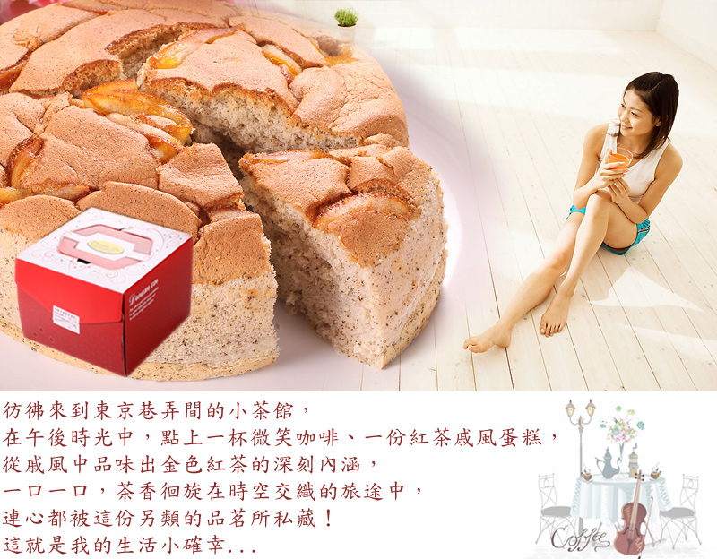 彷彿來到東京巷弄間的小茶館。在午後時光中,點上一杯微笑咖啡、一份紅茶戚風蛋糕,從戚風中品味出金色紅茶的深刻內涵。一口一口,茶香徊旋在時空交織的旅途中,連心都被這份另類的品茗所私藏!